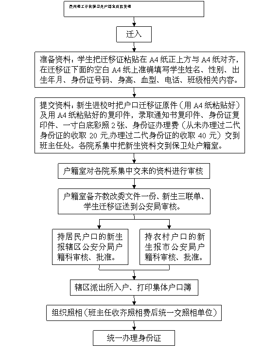 2.迁移户口的新生,按相关规定在入学时迁入,并在918备齐所有户籍资料,以院系为单位,交到保卫处户籍室,逾期将不再办理户口迁移。